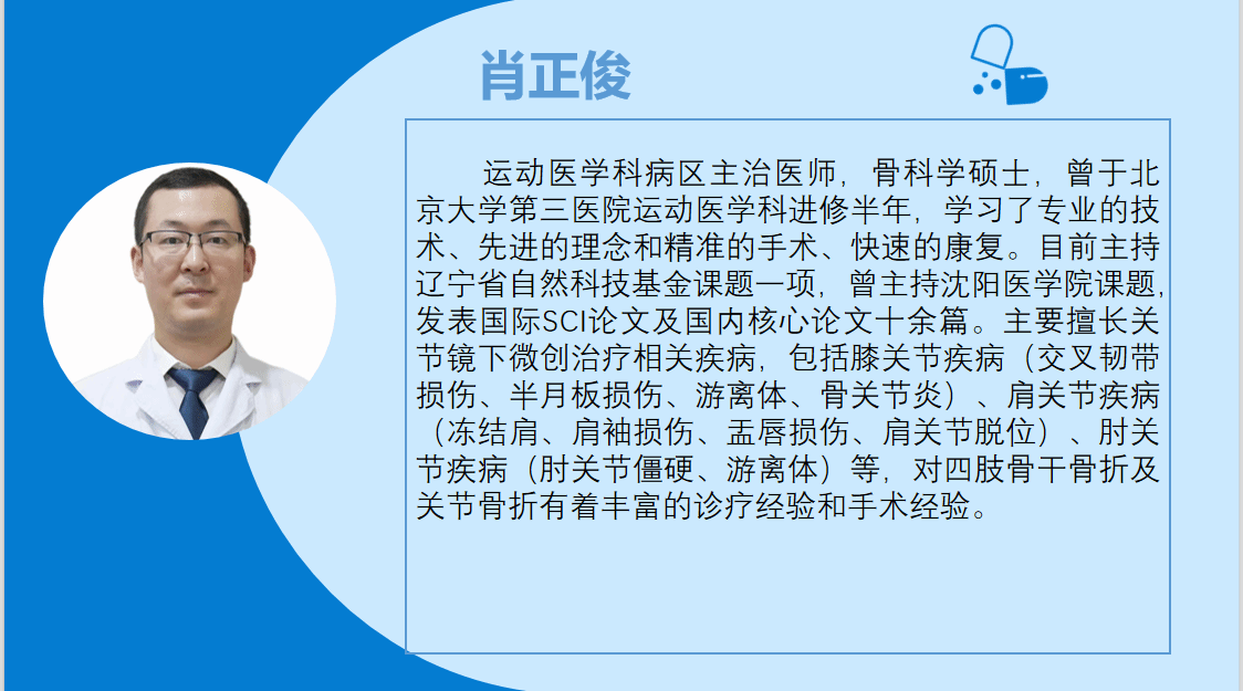 肖正俊医生,现任运动医学科病区主治医师,骨科学硕士,曾于北京大学第三医院运动医学科进修半年,学习了专业的技术、先进的理念和精准的手术、快速的康复。主要擅长关节镜下微创治疗相关疾病,包括膝关节疾病(交叉韧带损伤、半月板损伤、游离体、骨关节炎)、肩关节疾病(冻结肩、肩袖损伤、盂唇损伤、肩关节脱位)、肘关节疾病(肘关节僵硬、游离体)等,对四肢骨干骨折及关节骨折有着丰富的诊疗经验和手术经验。