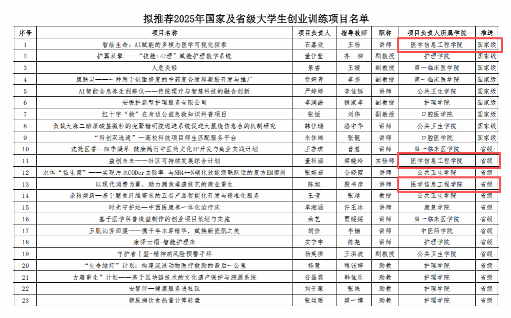 近日,2025 年大学生创新创业训练计划立项结果公布,金年会jinnianhuicom在本次评选中收获颇丰,共 21 个项目成功立项,其中其中国家级 3 项、省级 10 项、校级 8 项,立项覆盖创新训练、创业训练、创业实践三大类别,展现了学院在创新创业教育领域的扎实基础。