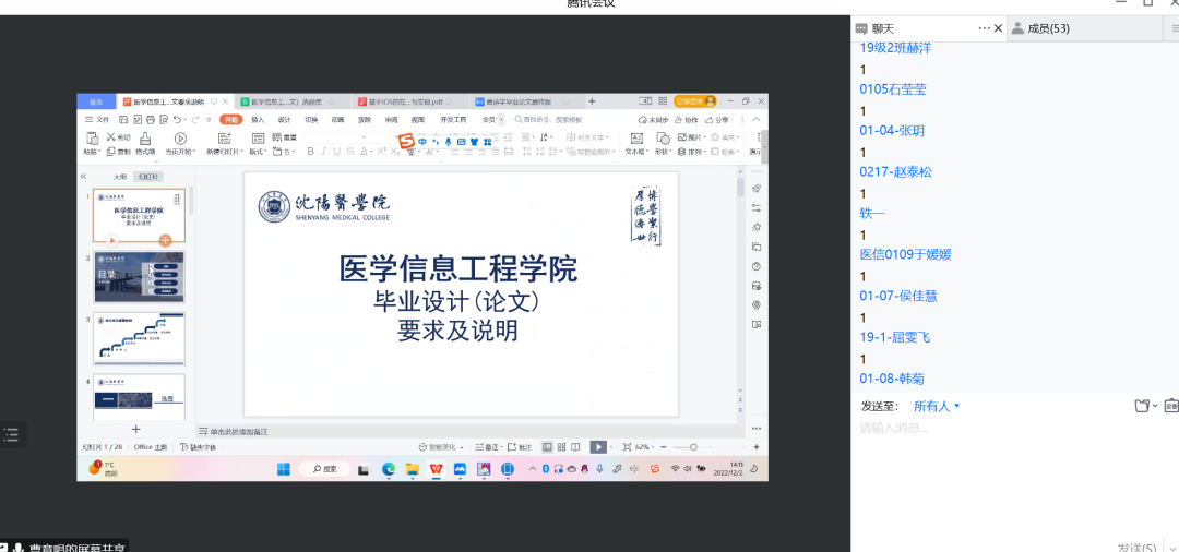 信息工程教研室教师曹意唱从毕业论文流程、选题、论文写作方法及重点注意事项等多方面为同学们进行了介绍,督促同学们应尽早与指导教师联系,完成选题工作。按照专业培养目标完成毕业设计(论文),结合医学知识底蕴展现工科特色完成毕业设计,认真对待毕业设计(论文)各项工作,善用文献检索,规范撰写论文。