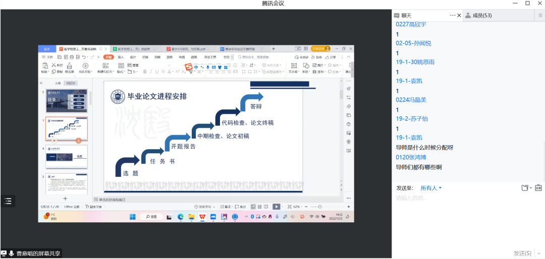参会的同学们也纷纷进行提问,询问指导教师分配、各项材料上交时间要求等相关问题,进一步明确了毕业论文的答辩准备要求和相关材料撰写的注意事项,为毕业论文撰写工作奠定了良好的基础。